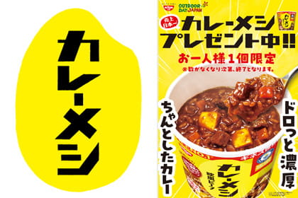 日清カレーメシブースにご来場頂いた方にキャンプ飯としても手軽に楽しめる「カレーメシ」をおひとり様1個限定でプレゼントいたします。
