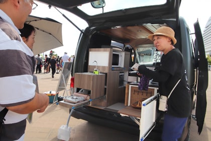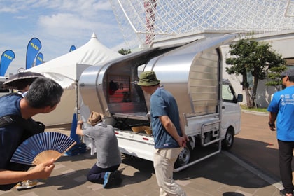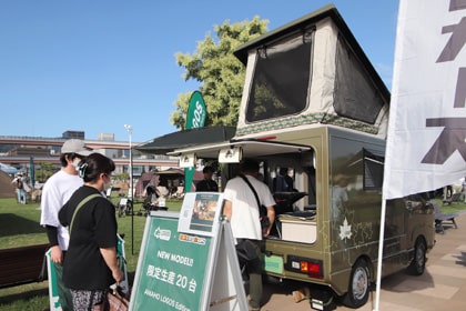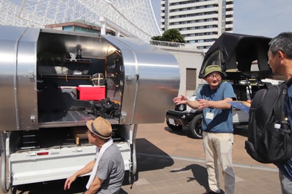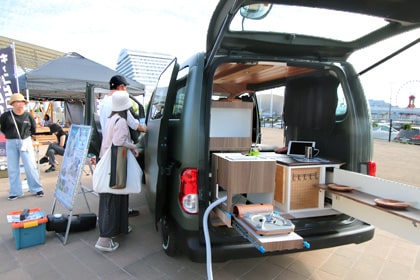 最大の特徴は、簡単な工具一つで軽トラックへの積み込み、積み降ろしができること。他にも、曲線を多用したデザイン性あふれるフォルム、全面開放する天井パネルなど、今までのキャンピングカーにはなかった魅力満載の商品です。