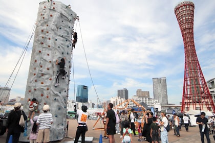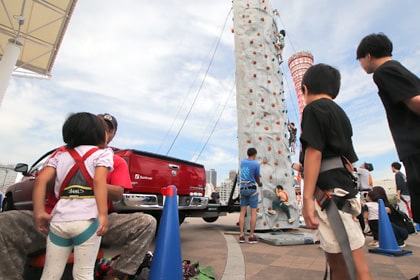 アウトドアデイジャパン会場に8メートルのタワー型クライミングウォールを設置! ハーネスを装着してスタッフ補助のもとボルダリングを体験いただけます。